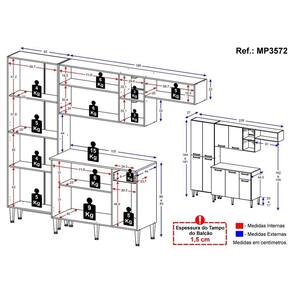 Dimensões do produto montado: Cozinha: Altura: 184 cm - Largura: 228 cm - Profundidade: 27 cm (aéreos e paneleiro) - 44,5 cm (balcão com tampo) Espaço do nicho para fogão/geladeira: Altura: 162 cm - Largura: 61 cm *Você pode consultar as medidas internas na imagem técnica do produto.