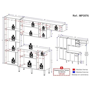 Conteúdo da Embalagem: 1 (um) armário aéreo com nicho lateral e horizontal de 166 cm 1 (um) paneleiro duplo de 62 cm 1 (um) balcão com tampo de 105 cm 1 (um) kit com 2 Luminárias LED