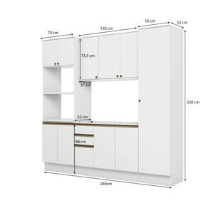 Prático e compacto, o combo CB1300 da Cozinha Celeste da Kappesberg é a opção perfeita para quem busca otimizar espaço sem deixar de lado a organização. Com quatro peças, ele conta com as divisórias perfeitas, e produzido em MDF de 15mm, ele garante robustez, firmeza e qualidade, além de um acabamento perfeito, encaixando perfeitamente em todos os ambientes. Com até sete camadas de pintura, seu acabamento brilho na cor branca garante luminosidade e elegância ao espaço, sendo ideal para cozinhas, além da facilidade na limpeza. Com módulo para eletrodomésticos, o kit forno e microondas possui prateleiras reforçadas em 25mm, garantindo o máximo de segurança. Medindo 2,30m de altura e 2,40m de largura, é uma ótima opção para quem possui pouco espaço e não abre mão de versatilidade no dia a dia. E para um melhor acabamento, o combo possui pés, mas acompanha as ferragens para ser montado suspenso na parede, deixando sua cozinha do seu jeito. Os diferenciais ficam por conta das dobradiças com amortecimento, garantindo um fechamento suave e sem ruídos, das corrediças telescópicas e os puxadores na cor dourada, com modelos diferentes no balcão e aéreos, completando o estilo e a qualidade do produto. Viva momentos especiais e renove seu espaço com a Cozinha Celeste da Kappesberg.
