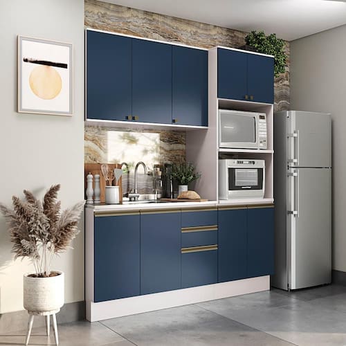 Complete sua cozinha com toda a beleza e praticidade que o Combo CB1299 da Cozinha Celeste da Kappesberg oferece. Compacto e funcional, ele conta com as divisórias perfeitas para manter seu espaço sempre organizado. Produzida em MDF de 15mm, o que proporciona robustez, firmeza e qualidade, além de um acabamento perfeito, o combo possui três peças, encaixando facilmente em todos os ambientes. E com até sete camadas de pintura, a caixaria é em pintura na cor branca e acabamento brilho, enquanto as frentes são na cor azul profundo com acabamento fosco. Uma combinação marcante e moderna, perfeita para quem busca por design e estilo em cada detalhe, deixando sua cozinha com um diferencial único. Com módulo para eletrodomésticos, o kit forno e microondas possui prateleiras reforçadas em 25mm, garantindo o máximo de segurança. Com três peças, o conjunto possui 2,30m de altura e 1,92m de largura, uma ótima opção para quem possui pouco espaço mas não abre mão de organização. E para um melhor acabamento, o combo possui pés, mas acompanha as ferragens para ser montado suspenso na parede, deixando sua cozinha do seu jeito. Os diferenciais ficam por conta das dobradiças com amortecimento, garantindo um fechamento suave e sem ruídos, das corrediças telescópicas e os puxadores na cor dourada, com modelos diferentes no balcão e aéreos, completando o estilo e a qualidade do produto. Viva momentos especiais e renove seu espaço com a Cozinha Celeste da Kappesberg.
