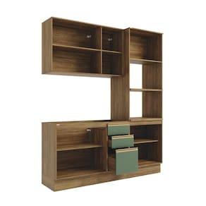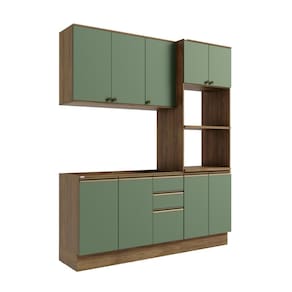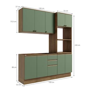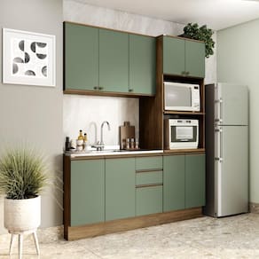 Complete sua cozinha com toda a beleza e praticidade que o Combo CB1299 da Cozinha Celeste da Kappesberg oferece. Compacto e funcional, ele conta com as divisórias perfeitas para manter seu espaço sempre organizado. Produzida em MDF de 15mm, o que proporciona robustez, firmeza e qualidade, além de um acabamento perfeito, o combo possui três peças, encaixando facilmente em todos os ambientes. Com até sete camadas de pintura, a caixaria é em pintura touch na cor nogueira, com a textura dos veios da madeira, enquanto as frentes são na cor verde oliva com acabamento fosco. Uma combinação moderna e aconchegante, remetendo aos tons da natureza e trazendo frescor e elegância ao ambiente, perfeita para preparar receitas e receber sua família e amigos. Com módulo para eletrodomésticos, o kit forno e microondas possui prateleiras reforçadas em 25mm, garantindo o máximo de segurança. Com três peças, o conjunto possui 2,30m de altura e 1,92m de largura, uma ótima opção para quem possui pouco espaço mas não abre mão de organização. E para um melhor acabamento, o combo possui pés, mas acompanha as ferragens para ser montado suspenso na parede, deixando sua cozinha do seu jeito. Os diferenciais ficam por conta das dobradiças com amortecimento, garantindo um fechamento suave e sem ruídos, das corrediças telescópicas e os puxadores na cor dourada, com modelos diferentes no balcão e aéreos, completando o estilo e a qualidade do produto. Viva momentos especiais e renove seu espaço com a Cozinha Celeste da Kappesberg.