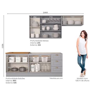 Composicao do Kit (AxLxP): 1 Aereo 03 Portas 83 x 120 x 32,5 Cm; 1 Aereo 01 Porta Basc. 34 x 80 x 32,5 Cm; 1 Balcao 02 Portas 82 x 80 x 51 Cm; 1 Balcao Pia 03 Portas e 02 Gavetas 82 x 120 x 51 Cm; 1 Tampo p/Cooktop 2,5 x 80 x 53,5 Cm;