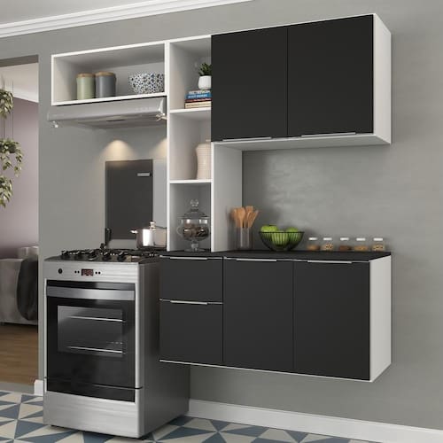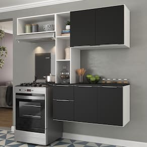 A Cozinha Compacta com Armário e Balcão Sofia Multimóveis tem um excelente custo benefício e é ideal para espaços compactos. Produzida em MDP com acabamento acetinado (cerca de 20% de brilho), que garante maior durabilidade e resistência, possui uma gaveta com corrediças metálicas (mais leveza no manuseio), puxadores em ABS e tampo em MDP 15mm com pintura de alta resistência. Este modelo de balcão não é indicado para utilização de pia. Por ser um modelo de cozinha suspensa (não acompanha pés), você pode ajustar a altura dela para encaixar a geladeira e/ou fogão conforme sua necessidade e o nicho aéreo é individual, ou seja, você pode montar de ambos os lados.