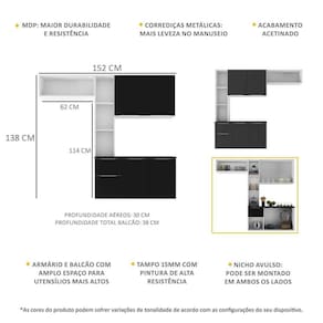 Dimensões do produto montado: Altura: 138cm | Largura: 152cm | Profundidade: 30cm (aéreos) - 38cm (balcão com tampo) Espaço para fogão/geladeira - Altura: ajustável - Largura: 62cm *Você pode consultar as medidas internas na imagem técnica do produto.