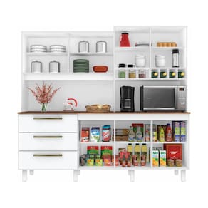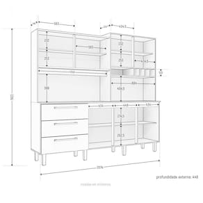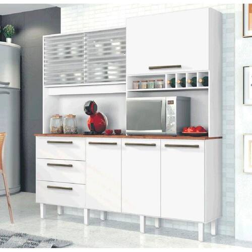 O Armário Mega possui design moderno e qualidade única, é o móvel ideal para sua cozinha. Possui seis portas, sendo duas de vidro temperado e serigrafado, uma basculante com pistão a gás, e três de abrir, três gavetas espaçosas, a primeira com divisória para talheres, todas com corrediças telescópicas que proporcionam maior amplitude de abertura, três prateleiras internas com excelente espaço para armazenagem de produtos e utensílios. Também contém espaço para micro-ondas, nicho e garrafeiro, tampo em MDP 15mm com acabamento uv-verniz preto texturizado e oito pés com regulagem de altura.