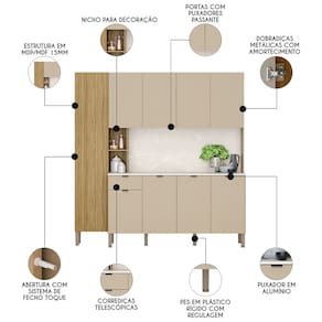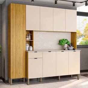 Com um design compacto e muito funcional, esse armário kit de cozinha é perfeito para otimizar o espaço do seu ambiente, de modo a deixar a sua cozinha mais prática e organizada, já que conta com excelente repartição interna, com diversas prateleiras para acomodar todas as suas panelas, louças, eletros e demais itens de cozinha. Já o charme fica por conta da porta do paneleiro, que além de ser em MDF, ainda possui detalhe riscatto na cor freijó e abertura com fecho magnético, garantindo praticidade e segurança. Para completar, as dobradiças com amortecedores e corrediças telescópicas proporcionam um fechamento suave e silencioso, resultando em um armário duradouro e resistente.