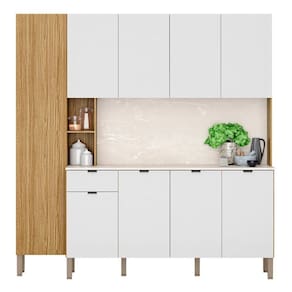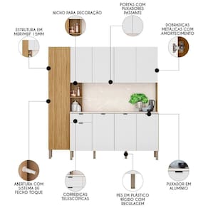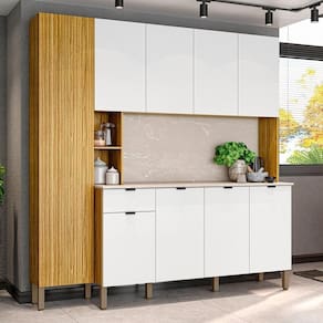 Com um design compacto e muito funcional, esse armário kit de cozinha é perfeito para otimizar o espaço do seu ambiente, de modo a deixar a sua cozinha mais prática e organizada, já que conta com excelente repartição interna, com diversas prateleiras para acomodar todas as suas panelas, louças, eletros e demais itens de cozinha. Já o charme fica por conta da porta do paneleiro, que além de ser em MDF, ainda possui detalhe riscatto na cor freijó e abertura com fecho magnético, garantindo praticidade e . Para completar, as dobradiças com amortecedores e corrediças telescópicas proporcionam um fechamento suave e silencioso, resultando em um armário duradouro e resistente.