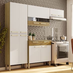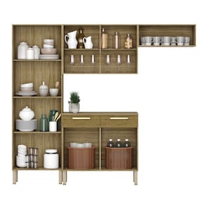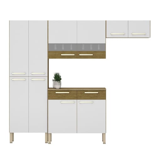 O Paneleiro conta com quatro portas, enquanto o Balcão vem com duas portas e duas gavetas. O Armário Aéreo possui duas portas com um detalhe em vidro na parte central, que adiciona um toque de delicadeza e sofisticação ao móvel. O Armário de Geladeira, com duas portas, complementa perfeitamente o conjunto. As quatro prateleiras internas oferecem excelente capacidade de armazenar mantimentos, utensílios e louças em geral, de forma prática e eficiente.