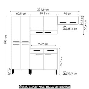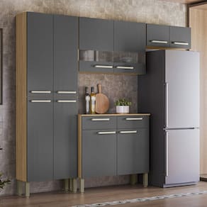 O Paneleiro conta com quatro portas, enquanto o Balcão vem com duas portas e duas gavetas. O Armário Aéreo possui duas portas com um detalhe em vidro na parte central, que traz leveza ao móvel. O Armário de Geladeira, com duas portas, complementa perfeitamente o conjunto. As quatro prateleiras internas oferecem excelente capacidade de armazenar mantimentos, utensílios e louças em geral, de forma eficiente.
