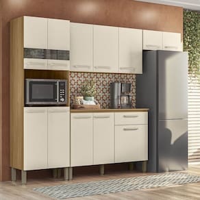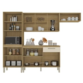 O Balcão dispõe de três portas e uma gaveta, e seu tampo serve como apoio para eletrodomésticos e itens do dia a dia, deixando tudo sempre ao alcance das mãos. Já o Armário Aéreo vem com três portas, enquanto o Armário de Geladeira, com duas portas, complementa o conjunto de forma harmoniosa e eficiente. Com amplo espaço de armazenamento, possui cinco prateleiras internas para acomodar utensílios, louças e mantimentos.