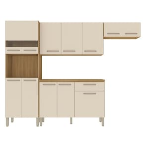 Este Armário de Cozinha é composto por quatro peças, cuidadosamente dispostas para atender às suas necessidades de organização. O Paneleiro conta com quatro portas, sendo as duas portas na parte superior com detalhe em vidro fumê, que acrescenta um charme extra à decoração. Além disso, possui um nicho para micro-ondas ou forno elétrico, com passa fio adesivo que oculta os cabos, garantindo um visual clean e livre de bagunça.