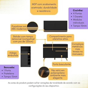 A Cozinha Compacta com Bancada Americana 1 Porta Veneza Multimóveis MP2207 é a solução ideal para quem busca praticidade e beleza na decoração da cozinha. Produzida em MDP com acabamento acetinado (cerca de 20% de brilho), garante durabilidade e um toque de elegância. Com 4 portas, sendo a menor basculante, e 1 gaveta com corrediças metálicas, que proporcionam mais leveza no manuseio, a cozinha possui amplo espaço interno para organização dos seus itens. Além disso, os pés retrô em polipropileno oferecem um design charmoso ao móvel. Os tampos de 15mm do balcão (suporta até 15kg) e da bancada (suporta até 20kg) são resistentes. Os módulos individuais permitem flexibilidade na montagem, adaptando-se perfeitamente ao seu espaço. Versátil, o balcão conta com tampo removível (compatível com pia de 120cm) e um compartimento especial para utensílios mais altos. Já a bancada possui 1 porta, prateleira interna e adega embutida, para acomodar bebidas e itens mais utilizados no dia a dia, além de poder ser utilizada como divisora de ambientes.