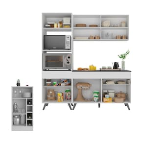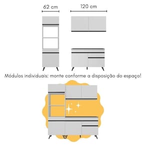 Cozinha Compacta Com Bancada Americana/mesa Veneza Multimóveis Mp2211 Branco/preto Branco/preto O Cozinha Compacta com Bancada Americana/Mesa Veneza Multimóveis MP2211 é produzido em MDP com acabamento acetinado (cerca de 20% de brilho), oferecendo durabilidade e um toque sofisticado. Com 6 portas, sendo 2 basculantes, 1 gaveta com corrediças metálicas (mais leveza no manuseio) e módulo para forno e micro-ondas, a cozinha proporciona amplo espaço interno de armazenamento. Os pés retrô em polipropileno e os puxadores em ABS adicionam charme extra ao design. Os tampos do balcão (suporta até 15kg) e da bancada (suporta até 20kg), ambos de 15mm, garantem resistência. Os módulos são individuais, permitindo a montagem de acordo com o espaço disponível. Versátil, o balcão possui tampo removível (compatível com pia de 120cm) e compartimento especial para utensílios mais altos. A bancada inclusa conta com 1 porta, prateleira interna e adega embutida, permitindo acomodar bebidas e itens mais utilizados no dia a dia, além de poder ser utilizada como divisora de ambientes. Este conjunto é uma ótima opção para agregar estilo e praticidade no lar! Conteúdo da Embalagem: 1 (um) Armário Aéreo 120cm 1 (um) Balcão com Tampo 120cm 1 (um) Armário para Forno e Micro-Ondas 62cm 1 (uma) Bancada/Mesa Manual de Montagem Kit Ferragem