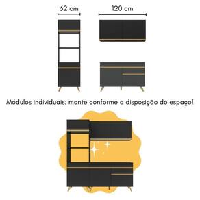 Cozinha Compacta Com Bancada Americana/mesa Veneza Multimóveis Mp2211 Preto/dourado Preto/dourado O Cozinha Compacta com Bancada Americana/Mesa Veneza Multimóveis MP2211 é produzido em MDP com acabamento acetinado (cerca de 20% de brilho), oferecendo durabilidade e um toque sofisticado. Com 6 portas, sendo 2 basculantes, 1 gaveta com corrediças metálicas (mais leveza no manuseio) e módulo para forno e micro-ondas, a cozinha proporciona amplo espaço interno de armazenamento. Os pés retrô em polipropileno e os puxadores em ABS adicionam charme extra ao design. Os tampos do balcão (suporta até 15kg) e da bancada (suporta até 20kg), ambos de 15mm, garantem resistência. Os módulos são individuais, permitindo a montagem de acordo com o espaço disponível. Versátil, o balcão possui tampo removível (compatível com pia de 120cm) e compartimento especial para utensílios mais altos. A bancada inclusa conta com 1 porta, prateleira interna e adega embutida, permitindo acomodar bebidas e itens mais utilizados no dia a dia, além de poder ser utilizada como divisora de ambientes. Este conjunto é uma ótima opção para agregar estilo e praticidade no lar! Conteúdo da Embalagem: 1 (um) Armário Aéreo 120cm 1 (um) Balcão com Tampo 120cm 1 (um) Armário para Forno e Micro-Ondas 62cm 1 (uma) Bancada/Mesa Manual de Montagem Kit Ferragem
