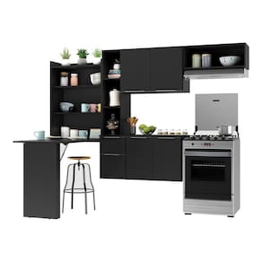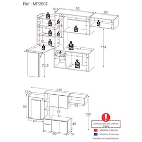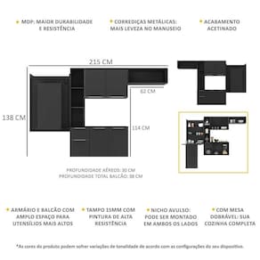 Dimensões do produto montado: Cozinha - Altura: 138cm | Largura: 152cm | Profundidade: 30cm (aéreos) - 38cm (balcão com tampo) Mesa Dobrável (aberta) - Altura: 163,5cm | Largura: 63cm | Profundidade: 107cmEspaço para fogão/geladeira - Altura: ajustável - Largura: 62cm *Você pode consultar as medidas internas na imagem técnica do produto.