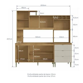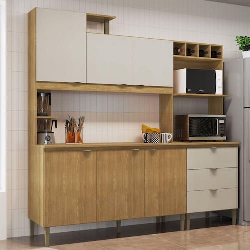 Cozinha Isa 203x205 Compacta com Tampo, Freijó/areia, Estrutura em mdp 12 mm, com 06 Portas, Dobradiças Caneco 26 mm, 03 Gavetas, Corrediças Metálicas, 03 Prateleiras, Puxador em pp, 09 Pés, Acabamento em Pintura Uv. Ideal para o Espaço Cozinha. Acabamento da Prateleira: Pintura Escala de Brilho da Prateleira: Semi-Brilho Acabamento da Gaveta: Pintura Escala de Brilho da Gaveta: Semi-Brilho Material do Puxador da Gaveta: Plástico Acabamento da Porta: Pintura Escala de Brilho da Porta: Semi-Brilho Material do Puxador da Porta: Plástico Acabamento dos Pés: Polipropileno Acompanha Tampo: Sim Altura dos Pés: 17 cm Ambiente Principal: Cozinha codigo_ean: 7908308767188 Complexidade da Montagem: Média: pode ser montado por mais de uma pessoa e/ou necessite de maior conhecimento para montagem Cor: Freijó/Chamois Cor do Produto: Freijó/Chamois Cor Interna: Freijó Escala de Brilho: Semi-Brilho Gaveta com Chave: Não Itens Inclusos: 1 Cozinha Compacta, Kit Ferragens e Manual de Montagem Manual de Montagem e Instalação: https://product-hub-prd.madeiramadeira.com.br/835645/documents/6ec1f51e-58c0-46dd-a909-cf358c94c4701222563manualcozisa.pdf Material da Dobradiça/Corrediça da Porta: Metálica Material da Gaveta: MDP Material da Porta: MDP Material da Prateleira: MDP Material do Fundo: MDP Material do Tampo: MDP Material dos Pés: Polipropileno Necessita Montagem: Sim O Balcão Acompanha Pia: Não Origem do Produto: Nacional Pés Reguláveis: Sim Peso: 93 kg Peso Máximo por Gaveta: 5 kg Peso Máximo por Prateleira: 7 kg Possui Pés: 09 Possui recorte para Cooktop: Não Possui Rodízio: Não Produto Montado: Sim Recomendações de Uso, Manutenção e Limpeza: Usar pano seco e macio para limpeza das superfícies Sapatas Niveladoras: Sim Sistema de Montagem: Parafusos, dobradiças Suporta Até (kg): 50 kg Tamanho Indicado do Tampo ou Pia: 120 Tipo de Corrediça da Gaveta: Simples Tipo de Dobradiça da Porta: Simples Tipo de Puxador da Gaveta: Externo Tipo de Puxador da Porta: Externo