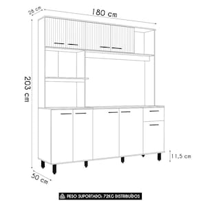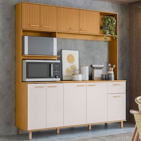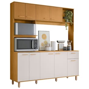 É composto por nove portas, sendo as quatro na parte superior com detalhe em ripado gráfico, que combina com diversos estilos de decoração. Além disso, dispõe de uma gaveta com corrediças telescópicas, permitindo abertura total com fácil acesso aos itens armazenados. Com amplo espaço interno, a Cozinha Compacta oferece duas prateleiras para acomodar seus utensílios e mantimentos com eficiência.