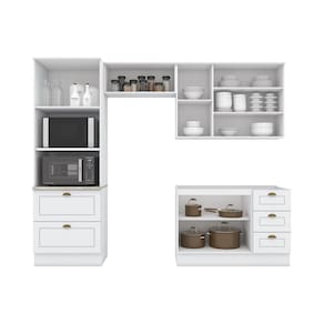 Composicao do Kit -AxLxP-: 1 Aereo 03 Portas 78 x 120 x 31,5 Cm; 1 Aereo 01 Porta Basc. 44 x 80 x 31,5 Cm; 1 Tampo 2,5 x 80 x 53,5 Cm; 1 Tampo p/Cooktop 2,5 x 80 x 53,5 Cm; 1 Ilha Gourmet 01 Porta Basc. 87 x 140 x 60 Cm; 1 Aereo Micro-ondas 44 x 80 x 47,5 Cm; 2 Balcao 02 Portas 87,5 x 80 x 51 Cm; 1 Balcao Pia 02 Portas e 03 Gavetas 87,5 x 120 x 51 Cm;