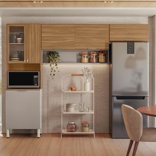 Praticidade e conforto no dia a dia Pensada para otimizar o espaço e facilitar o uso, a Cozinha Compacta Aspen possui seis portas e duas prateleiras bem distribuídas, além de um espaço funcional para a instalação de forno micro-ondas. As portas contam com dobradiças metálicas para maior estabilidade, e a porta basculante possui pistão a gás, que proporciona um movimento suave e seguro. Os puxadores em plástico ABS são fáceis de higienizar, enquanto os pés com regulagem de altura garantem o nivelamento perfeito do móvel, adaptando-se facilmente a diferentes tipos de piso.