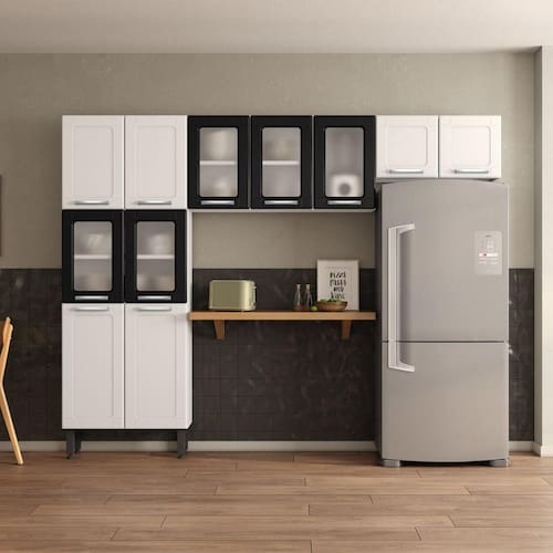 A cozinha compacta Bertolini é perfeita para você que procura funcionalidade e um design moderno que encaixe com a decoração que deseja. Com 11 portas ela oferece o espaço ideal pra você guardar todos os itens necessários. Além de contar com 5 portas de vidro, permitindo destacar seus objetos prediletos. O armário é uma ótima escolha para quem quer casar a alta qualidade, resistente às ações do tempo com espaço para eletrodomésticos como fogão e geladeira.