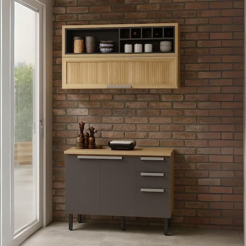 ? Armário aéreo de 120cm com 1 porta horizontal e nichos decorativos, perfeito para xícaras, potes, garrafas ou itens de uso frequente, unindo praticidade e um toque moderno à decoração.