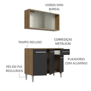 Possui um aéreo com duas portas de correr de vidro e um balcão com uma gaveta e três portas. O balcão acompanha o tampo, que pode ser removido para a colocação de pia.