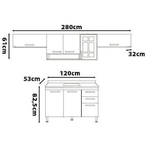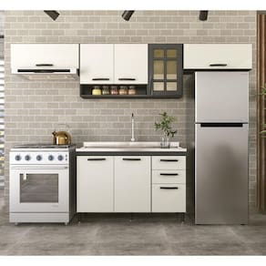 O armário aéreo que compõe esse conjunto possui três portas sendo uma delas com vidro, que se destaca pelo diferencial em sua forma, pois é usinada e desenhada em forma de quadrinhos. Já o seu par de armário de geladeira de 80cm de largura cada, é uma peça ideal para pôr em em sua casa. A sua porta em pistão a gás permite uma melhor abertura e fechamento do módulo.