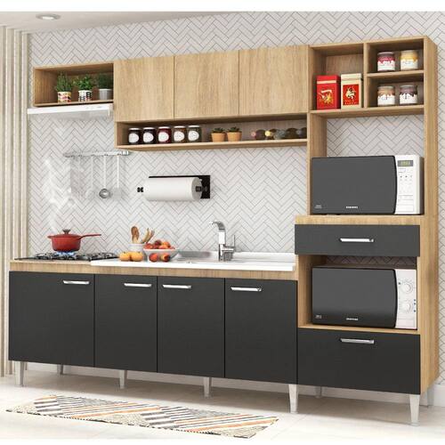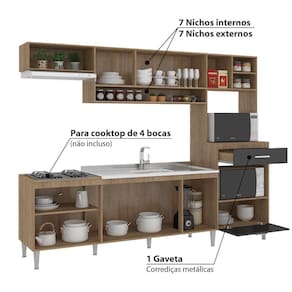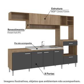 Características - Carvalho/Grafite - Estrutura: MDP 12 mm e portas em MDP 15 mm - Acabamento: Finish Foil - Fosco - 8 Portas - 1 Gaveta - 7 Nichos externos - 7 Nichos internos - Dobradiças e corrediças metálicas - Pés niveladores de 17 cm - Espaço para cooktop de 4 bocas (não incluso) - Tampo não recortado - Puxadores ABS cromados de 16 cm com verniz protetor - Peso suportado: 60 kg - Móvel entregue desmontado - Marca: Fellicci