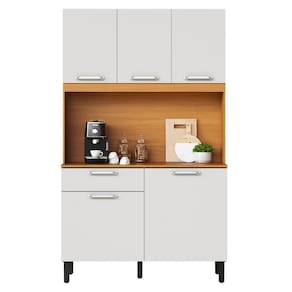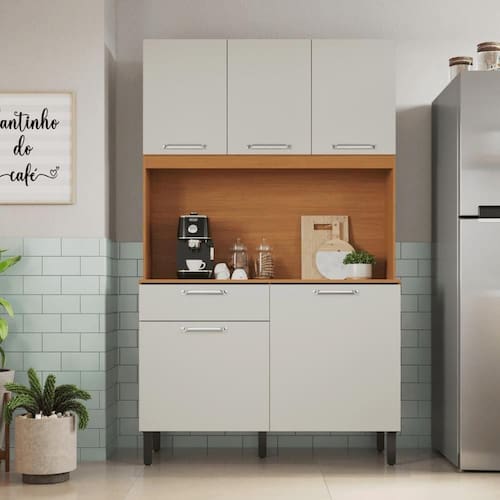 Estrutura em MDP de qualidade. Mais leve, resistente e ideal para ambientes internos.Dobradiças reforçadas de 26 mm. Mais , firmeza e vida útil para as portas.Corrediças telescópicas. Gavetas que deslizam com suavidade total e abertura completa nada de forçar ou inteligente. Espaços bem distribuídos para armazenar utensílios, mantimentos e o que mais você quiser, com fácil moderno. O contraste entre a madeira cinamomo e o off white dá um toque sofisticado, combinando com vários estilos de decoração.