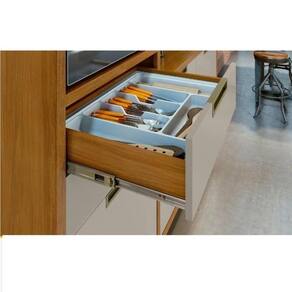 As gavetas, também com puxadores embutidos, têm corrediças telescópicas que permitem abertura total e ainda acompanham um organizador de talheres.