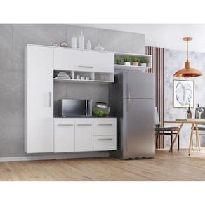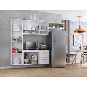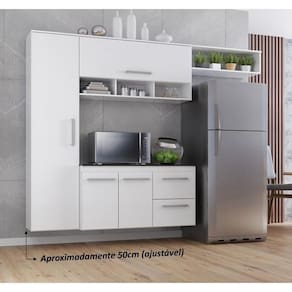 Cozinha Lua | Desenvolvemos essa cozinha para deixar seu lar bem mais bonito e organizado. A cozinha Lua possui exatamente o que você precisa para guardar seus itens de cozinha. Com duas gavetas com corrediças metálicas, portas com dobradiças metálicas e porta superior basculante com pistão a gás você certamente vai gostar muito do seu novo móvel. Disponível em 3 cores diferentes e fabricada em chapas de MDP de 12mm que possui uma pintura em UV Relevo Touch ou Alto Brilho de alta resistência a riscos. O módulo do balcão é avulso, já o paneleiro com os módulos aéreos não podem ser montados separados, porém pode-se inverter a posição deles colocando o paneleiro na direita e o geladeira na esquerda. Medidas totais: Altura: 1,5M x Largura: 1,9M x Profundidade: 0,36M ATENÇÃO: Recomendado geladeira de até 1,76M de altura Descrição