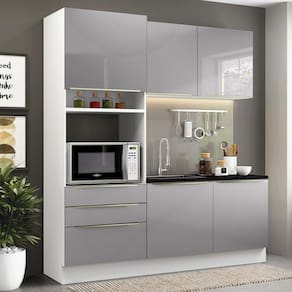 O acabamento da estrutura é branco e as portas e as frentes das gavetas são cinzas. É feito em Pintura Poliéster com aplicação de 7 camadas de proteção resistentes a álcool, água e calor.
