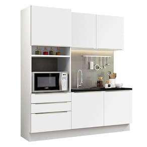 Todos os puxadores são em alumínio, mais resistentes ao uso diário e os pés são reguláveis em PVC, com rodapé removível em MDP para facilitar na hora de fazer a limpeza.