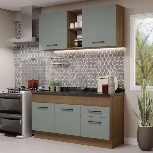 A modulação é composta por um balcão para pia e um armário aéreo. Super espaçosos e com ótimo tamanho, são perfeitos para organizar todos os utensílios e louças da sua cozinha.