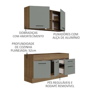Fabricada com itens de qualidade, possui puxadores com alça em alumínio, dobradiças que amortecem o fechamento das portas e corrediças telescópicas que permitem a abertura total das gavetas.