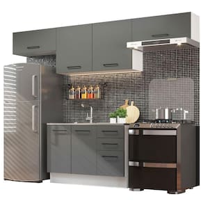 O acabamento da estrutura é branco e as portas e frentes das gavetas são cinzas. É feito em Pintura Poliéster, com 7 camadas de proteção resistentes a álcool, água e calor.