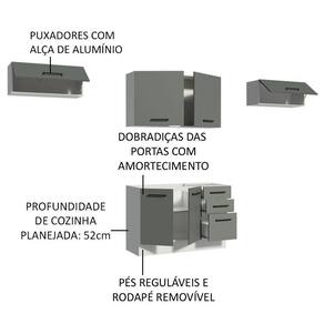 Todas as portas contam com puxador com alça de alumínio e dobradiças que amortecem o fechamento e as gavetas possuem corrediça telescópica.