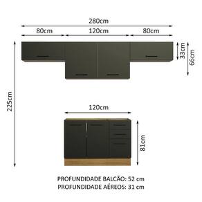 Medidas totais da cozinha: 225 cm de altura, 280 cm de largura e profundidade de 52 cm no balcão e 31 cm nos aéreos.