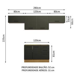Medidas totais da cozinha: 225cm de altura, 280cm de largura e profundidade de 52cm no balcão e 31cm nos aéreos.