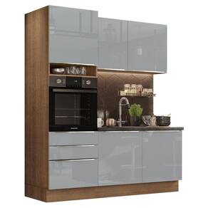 As medidas totais da cozinha são: 180 cm de largura x 225 cm de altura. A profundidade é de 60 cm nos módulos inferiores e 31 cm nos aéreos. O balcão comporta pias de 120 cm x 60 cm. Não acompanha tampo.