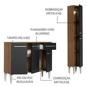 A combinação do paneleiro de duas portas e do balcão com três portas e uma gaveta oferece ótimo espaço para organização de talheres, louças e demais utensílios de cozinha. Além disso, o balcão comporta pias de 105 cm x 44 cm e acompanha tampo de MDP.