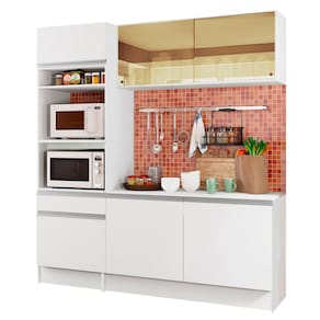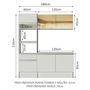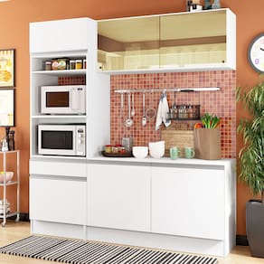 Itens inclusos: - Uma (1) torre com nichos para forno e micro-ondas, com uma (1) gaveta e duas (2) portas, sendo uma basculante com um (1) balcão agregado de 120 cm com duas (2) portas - Um (1) aéreo de 120 cm com portas deslizantes em vidro reflex - Um (1) tampo branco de MDP para balcão de pia de 120 cm x 52 cm