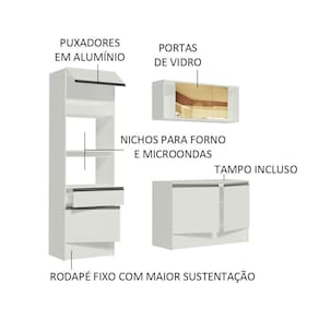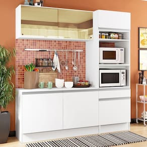 São várias portas, nichos, prateleiras e uma gaveta. Ou seja, não vai faltar espaço para você organizar todos os utensílios da cozinha.