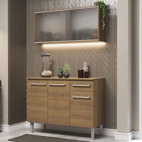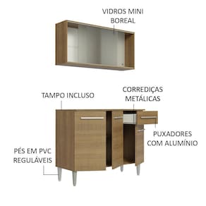 Possui um aéreo com duas portas de correr de vidro e um balcão com uma gaveta e três portas. O balcão acompanha o tampo, que pode ser removido para a colocação de pia.