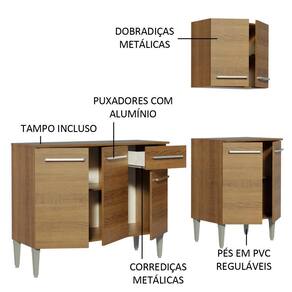 Possui puxadores com detalhe em alumínio e corrediças e dobradiças metálicas. Os pés são em PVC, para facilitar a limpeza e reguláveis para nivelar pequenas imperfeições no piso. Internamente, o espaço é bom para organizar louças e demais utensílios de cozinha. Para completar, ambos os balcões acompanham tampo em MDP.