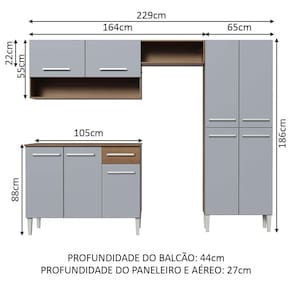 - 44 cm de profundidade no balcão e 27 cm de profundidade no aéreo e no paneleiro