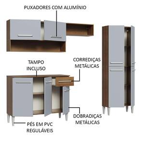 Um diferencial a mais é que acompanha o tampo de madeira do balcão. Para completar, os pés são em reguláveis em PVC: a altura da cozinha pode chegar a 188 cm com a regulagem dos pés.
