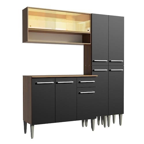O acabamento da estrutura é no padrão amadeirado rustic e as portas e frente são pretas. As partes internas das costas e da gaveta são brancas. O processo é feito em pintura poliéster ecológica com 7 camadas de proteção, que oferecem resistência contra os efeitos da água e do calor.