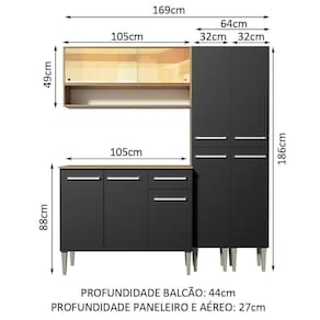 Medidas totais: 186 cm de altura x 169 cm de largura x 44 cm profundidade no balcão e 27 cm no aéreo e no paneleiro.