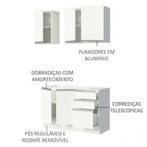 O acabamento da cozinha é branco, feito em Pintura Poliéster ecológica, com aplicação de 7 camadas de proteção resistentes a álcool, água e calor.